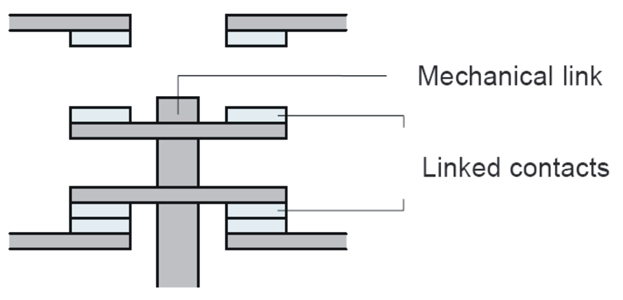 A safety circuit shall contain a control relays and/or contactors with positive-guided contacts used for switching power to the load. Each relay or contactor shall have at least one N/C contact in the restart circuit which is used for self-checking. This N/C contact remains open in the event of weld power contacts of the relay/contactor, and prevents the safety circuit from restarting. This type of contacts is commonly called Mechanically Linked or Positively Guided.